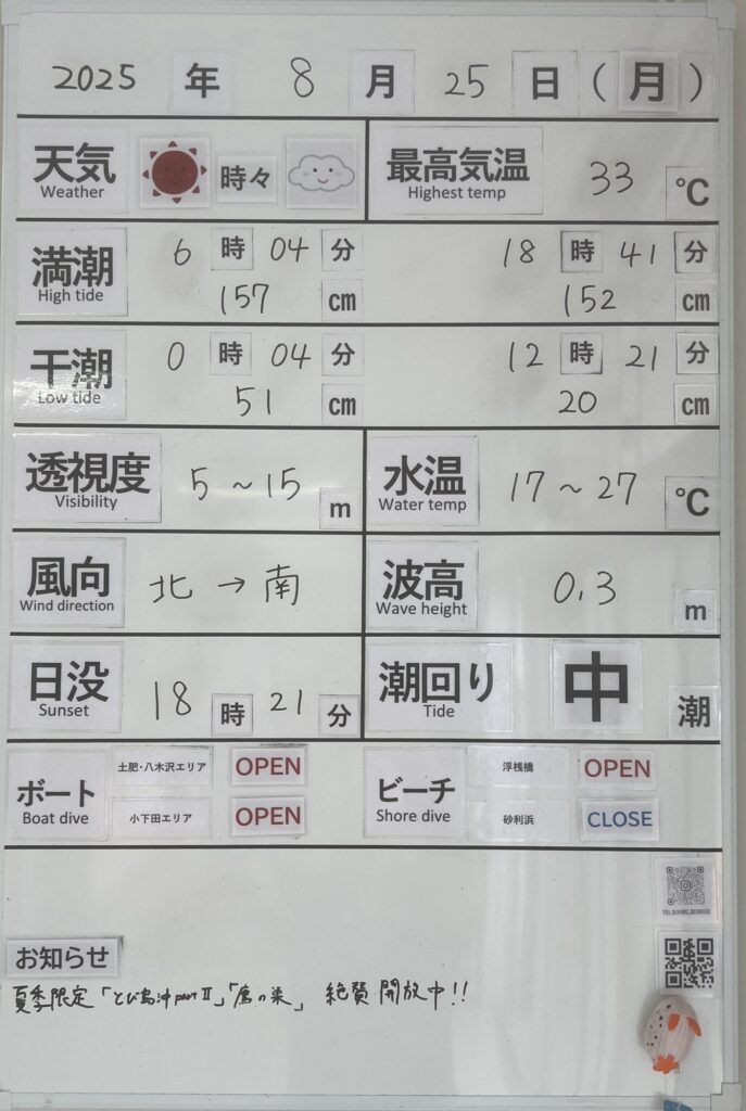 2025年8月25日 / 最終更新日 : 2025年8月25日 toids2021 海況情報 ビーチ&ボートともに【OPEN】です。 非常に穏やかな海況です。 ボートも小下田エリアまで全域快適に出船できます。 FacebookXCopy