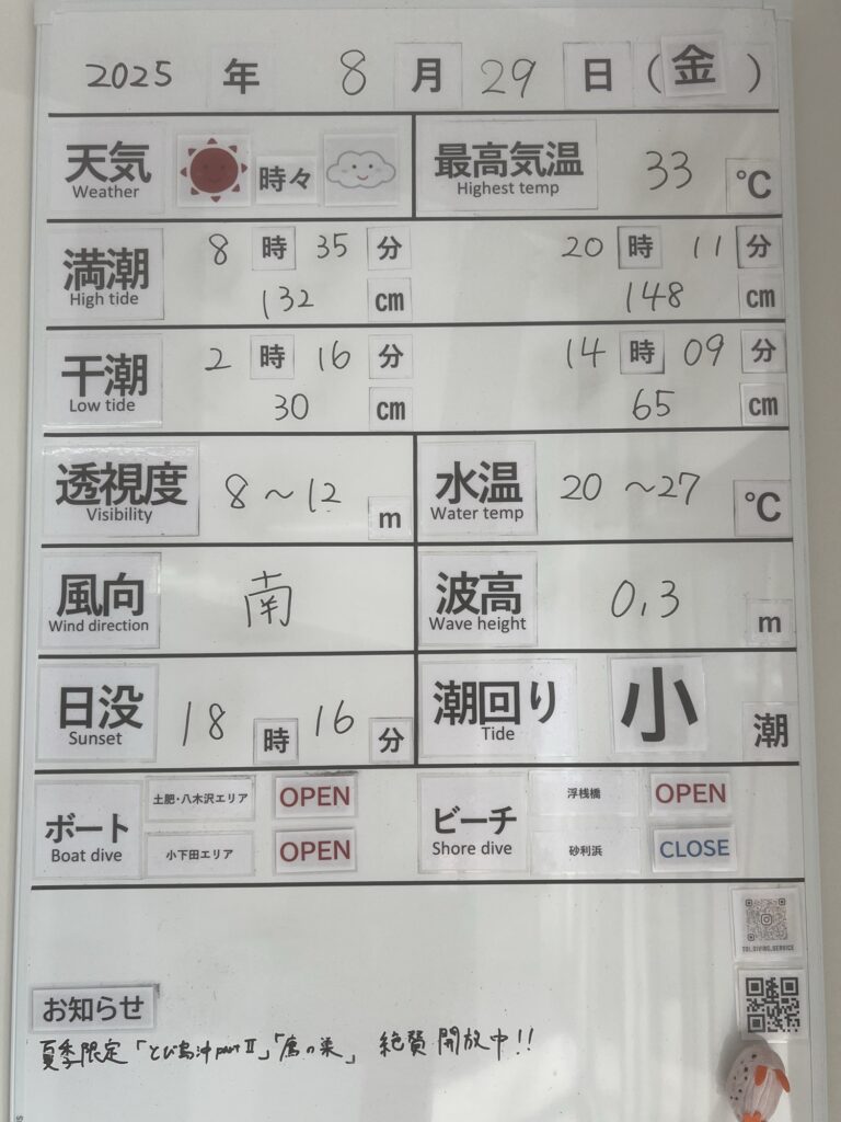 2025年8月29日 / 最終更新日 : 2025年8月29日 toids2021 海況情報 ビーチ&ボートともに【OPEN】です。 非常に穏やかな海況です。 ボートも全域終日快適に出船できます。 FacebookXCopy