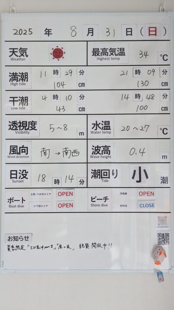 2025年8月31日 / 最終更新日 : 2025年8月31日 toids2021 海況情報 ビーチ&ボートともに【OPEN】です。 風もなく非常に穏やかな海況です。 ベタ凪で、ボートも全域快適に出航できます! FacebookXCopy