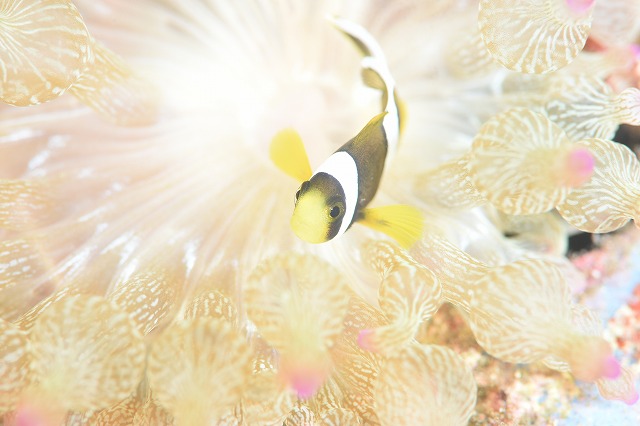 沈船の船首側にある小さいサンゴイソギンチャクにクマノミの幼魚が隠れていました。