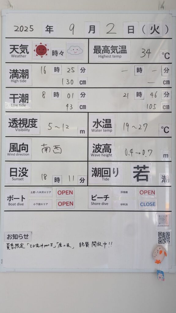 2025年9月2日 / 最終更新日 : 2025年9月2日 toids2021 海況情報 ビーチ&ボートともに【OPEN】です。 非常に穏やかな海況です! 午後からは南西風が強くなる予報ですので、ボートは早めが良いでしょう。 ビーチは終日ベタ凪でしょう。 FacebookXCopy
