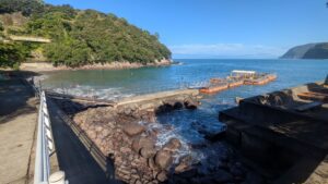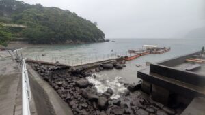 鉄壁の通り崎ビーチはOPENいたしましたが、浮桟橋は大きく揺れて危険なため単管ステージからのみのEn/Exに限定いたしました。