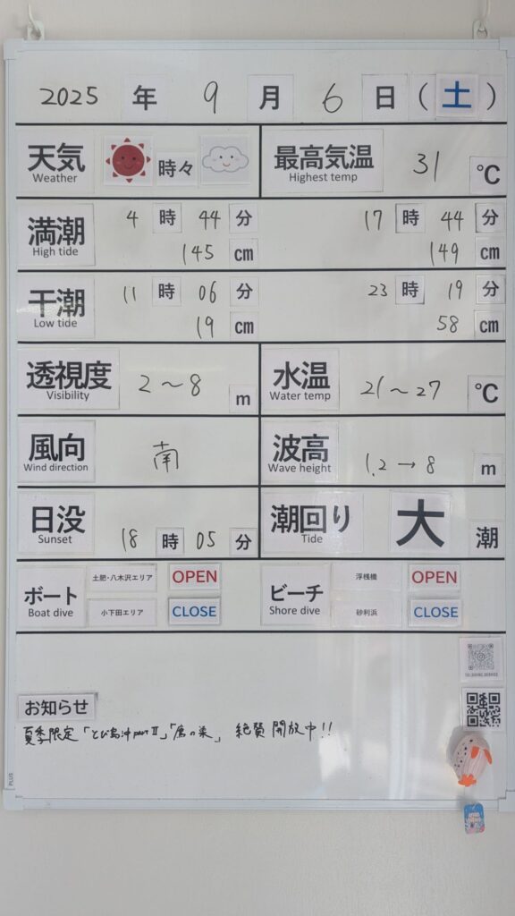 2025年9月6日 / 最終更新日 : 2025年9月6日 toids2021 海況情報 ビーチ&ボートともに【OPEN】です。 台風は過ぎましたが、まだうねりと濁りが残っています。 徐々に回復していくでしょう。 小下田エリアはまだうねりが大きいため、ボートは八木沢エリアのみのOPENといたします。 FacebookXCopy