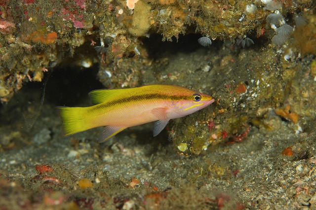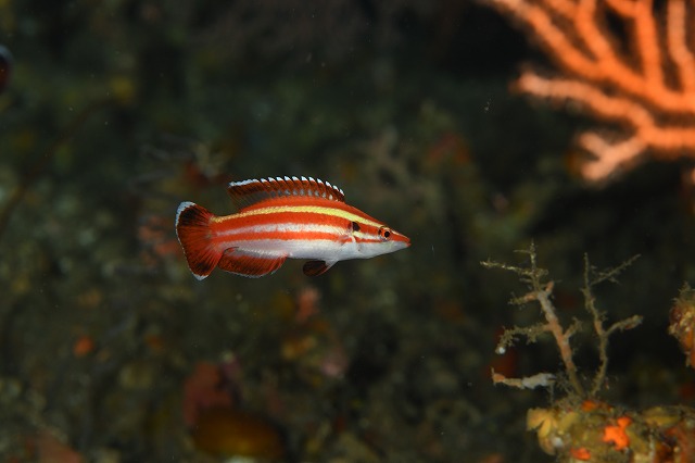 同じく岩陰を出たり入ったりしていたシマキツネベラ。