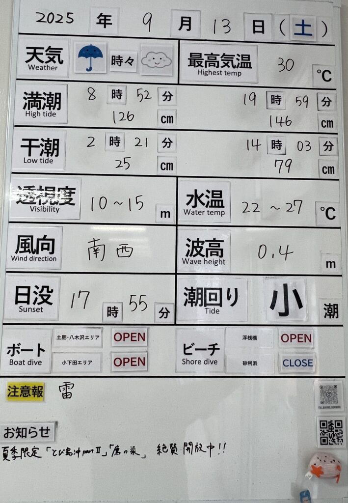 2025年9月13日 / 最終更新日 : 2025年9月13日 toids2021 海況情報 ビーチ&ボートともに【OPEN】です。 南西の風ですが穏やかな海況です。 ボートは小下田エリアまで問題なく出船できます。 FacebookXCopy