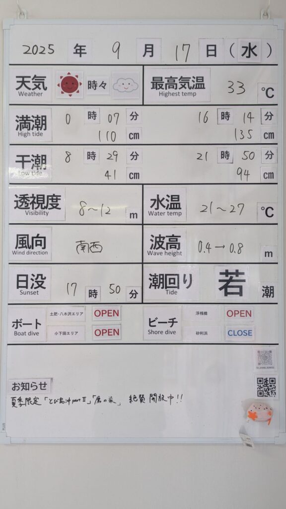 2025年9月17日 / 最終更新日 : 2025年9月17日 toids2021 海況情報 ビーチ&ボートともに【OPEN】です。 朝イチは非常に穏やかですが、これから南西風が強くなります。 ボートは朝イチ1本のみのOPENといたします。 ビーチは終日問題なく潜れます。 FacebookXCopy