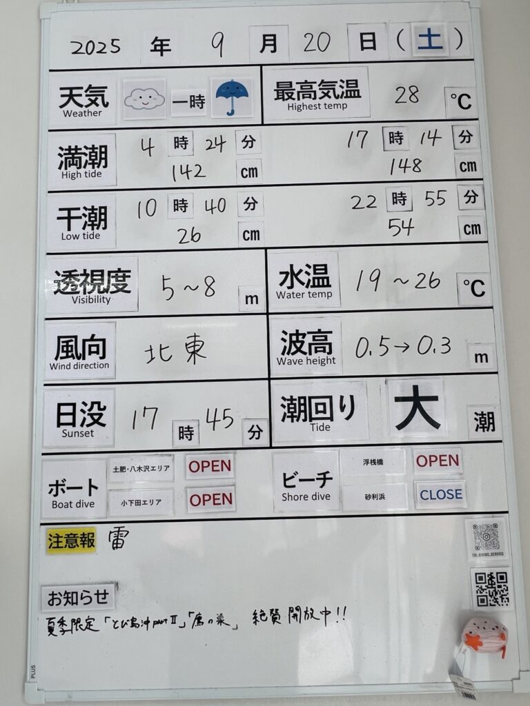 2025年9月20日 / 最終更新日 : 2025年9月20日 toids2021 海況情報 ビーチ&ボートともに【OPEN】です。 穏やかな海況です。 ボートは小下田エリアまで問題なく出船できます。 FacebookXCopy