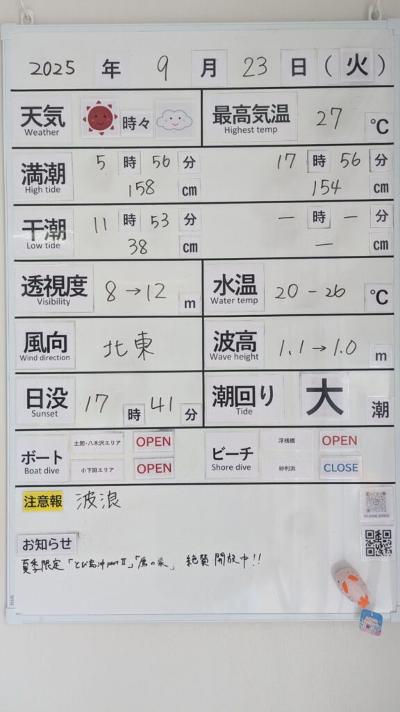 2025年9月23日 / 最終更新日 : 2025年9月23日 toids2021 海況情報 ビーチ&ボートともに【OPEN】です。 若干台風によるうねりが入ってきてはいますが、問題なく潜れます。 小下田エリアへも出船可能です。 FacebookXCopy