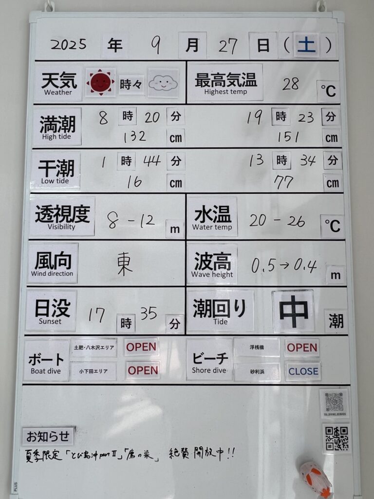 2025年9月27日 / 最終更新日 : 2025年9月27日 toids2021 海況情報 ビーチ&ボートともに【OPEN】です。 穏やかな海況です! ボートも小下田エリアまで問題なく出船できます。 FacebookXCopy