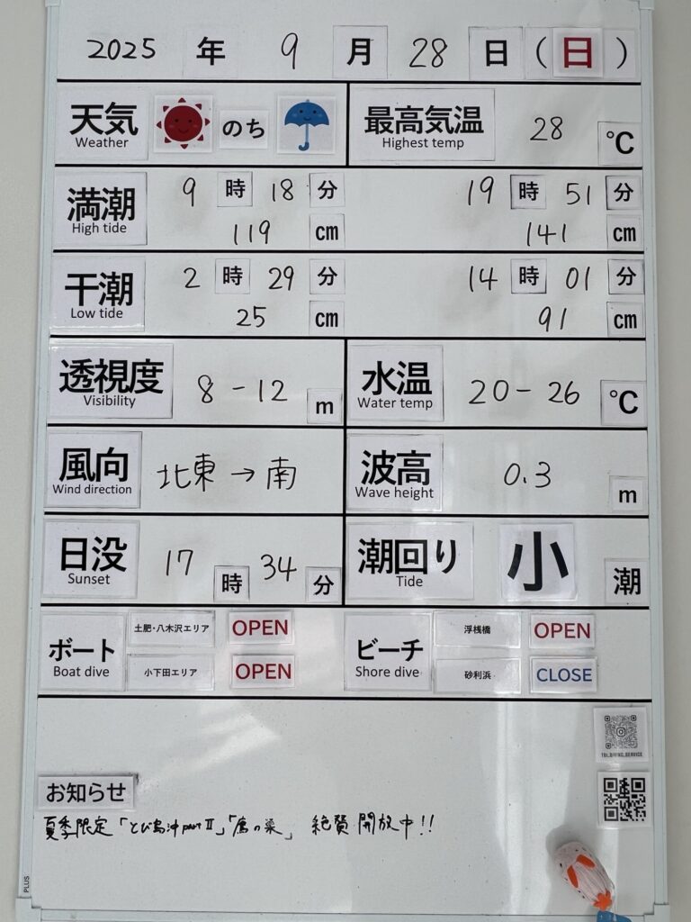 2025年9月28日 / 最終更新日 : 2025年9月28日 toids2021 海況情報 ビーチ&ボートともに【OPEN】です。 非常に穏やかな海況です! ボートは小下田エリアまで全域快適に出船できます。 FacebookXCopy