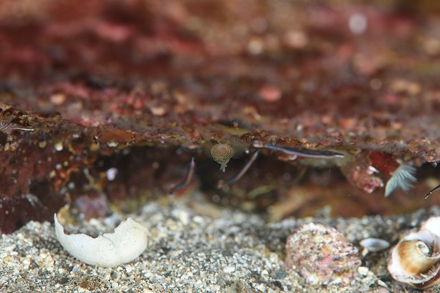 沈船から10m岩へ行く途中のミルにいいサイズのヒラツノモエビが登場です。