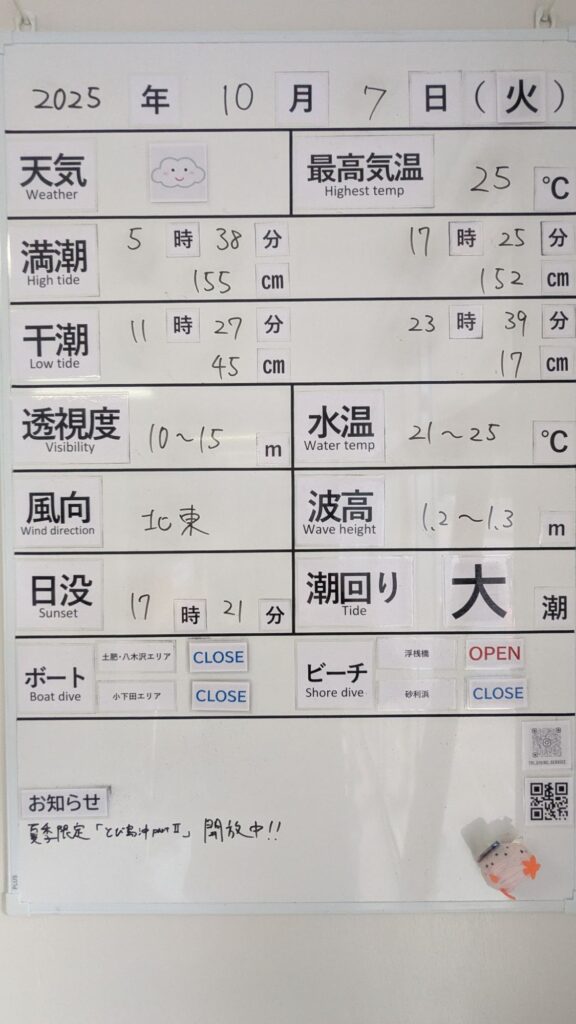 2025年10月7日 / 最終更新日 : 2025年10月7日 toids2021 海況情報 ビーチのみ【OPEN】、ボートは【CLOSE】です。 北東風が強すぎるため、出船が難しい状況です。 ビーチはまだ影響少なく、問題なく潜れます。 FacebookXCopy