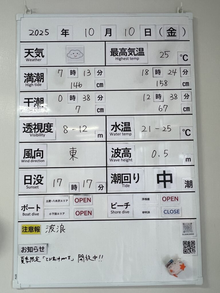 2025年10月10日 / 最終更新日 : 2025年10月10日 toids2021 海況情報 ビーチ&ボートともに【OPEN】です。 台風の影響も残らず穏やかな海況です! ボートは小下田エリアまで問題なく出船できます。 FacebookXCopy
