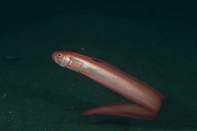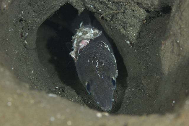 深場の砂地、おそらくシロアマダイが掘って使わなくなった穴にいるハモ。