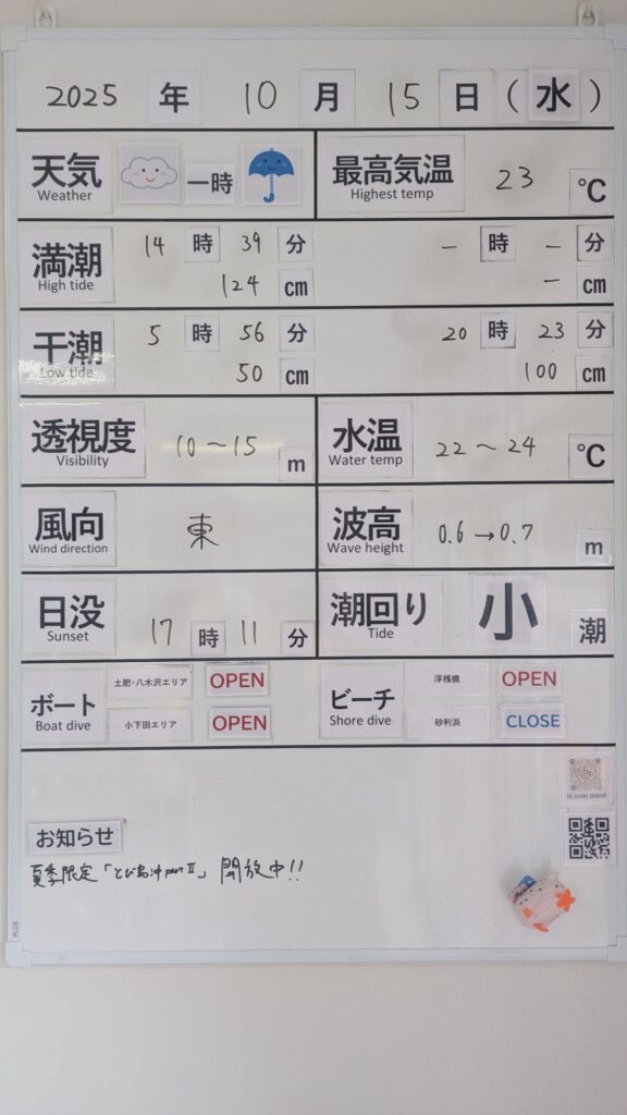 2025年10月15日 / 最終更新日 : 2025年10月15日 toids2021 海況情報 ビーチ&ボートともに【OPEN】です。 東風で非常に穏やかな海況です。 小下田エリアへも問題なく出船できます。 FacebookXCopy