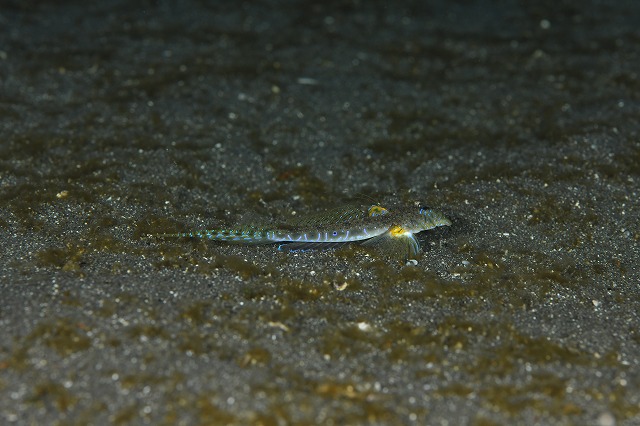 顔のあたりの模様が濃いのと、背鰭尻鰭の後端がバーコードのようにくっきりと縞模様なのが目印です。