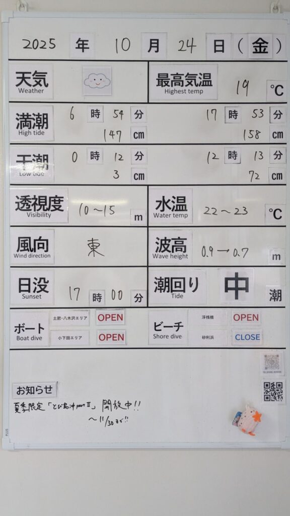 2025年10月24日 / 最終更新日 : 2025年10月24日 toids2021 海況情報 ビーチ&ボートともに【OPEN】です。 海は穏やかで問題なく潜れます。 東風が強く陸上が寒く感じますので、 寒さ対策をしっかりと! 洗い場の溜水は全てお湯です。 FacebookXCopy