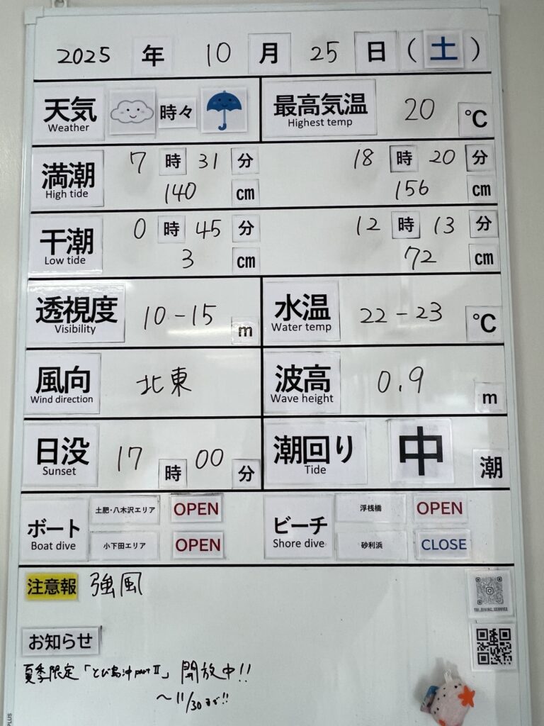 2025年10月25日 / 最終更新日 : 2025年10月25日 toids2021 海況情報 ビーチ&ボートともに【OPEN】です。 問題なくビーチ&ボートともにOPENです。 ボートは小下田エリアまで出船可能です。 時折強い風が吹きますので手荷物など飛ばされないようにご注意ください。 FacebookXCopy