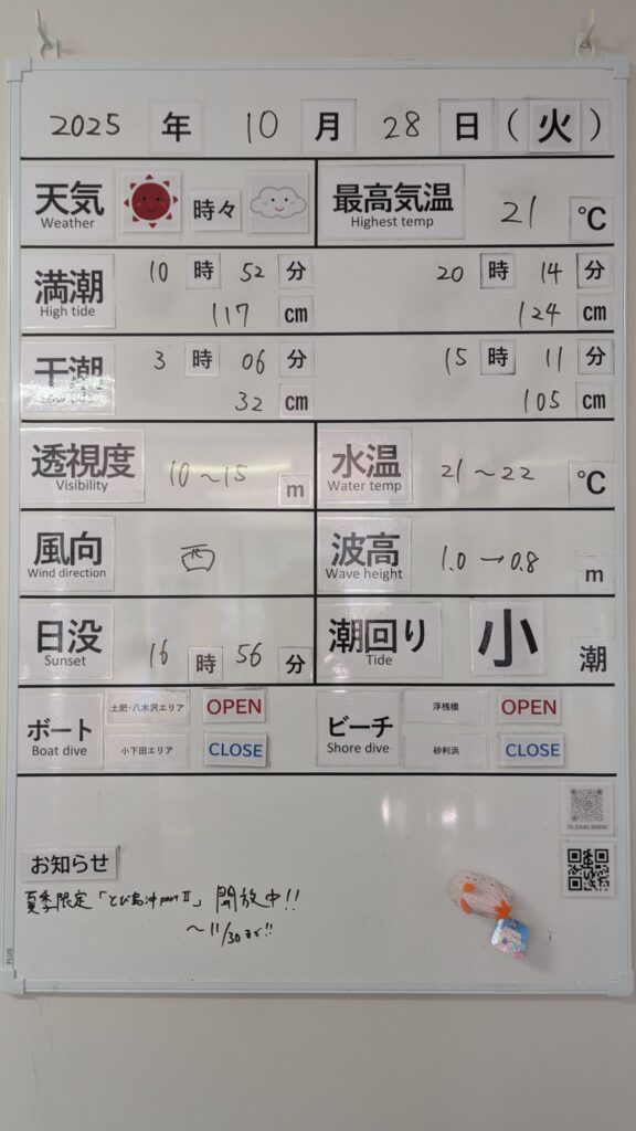 2025年10月28日 / 最終更新日 : 2025年10月28日 toids2021 海況情報 ビーチ&ボートともに【OPEN】です。 ビーチはいつも通り非常に穏やか! 西風の影響でうねりが大きいため、ボートは八木沢エリアのみのOPENといたします。 FacebookXCopy