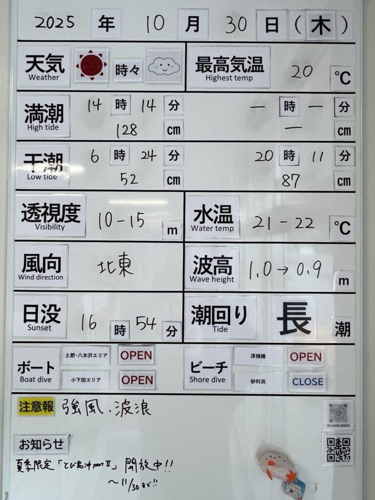 2025年10月30日 / 最終更新日 : 2025年10月30日 toids2021 海況情報 ビーチ&ボートともに【OPEN】です。 穏やかな海況です! ボートは小下田エリアまで出船可能です。 FacebookXCopy