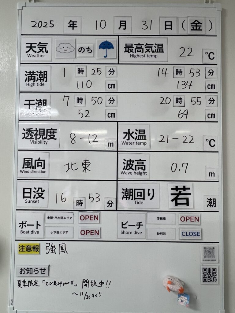 2025年10月31日 / 最終更新日 : 2025年10月31日 toids2021 海況情報 ビーチ&ボートともに【OPEN】です。 問題なくビーチ&ボートともにOPENです。 ボートは小下田エリアまで出船可能です。 午後から雨予報ですので寒さ対策をしっかりと! FacebookXCopy