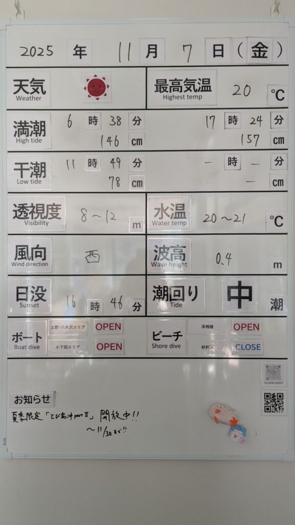 2025年11月7日 / 最終更新日 : 2025年11月7日 toids2021 海況情報 ビーチ&ボートともに【OPEN】です。 風もなく非常に穏やかな海況です。 ボートも快適に出航可能です。 FacebookXCopy
