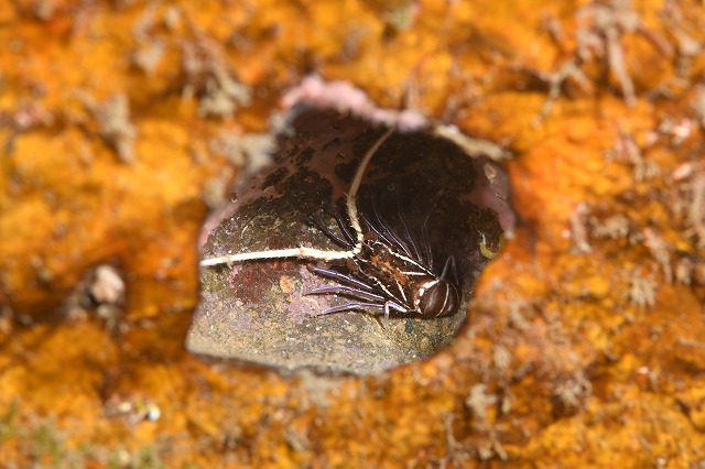 岩の穴をふさいでいたマガキガイを退かすと、もうこれ以上どこにも逃げられないと悟ったチビが天を仰いでいました。