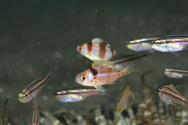 アカタマガシラ幼魚が1匹と、奥にタマガシラ幼魚が1匹、ヨスジフエダイの幼魚みたいなの(キュウセンフエダイ??)が2匹(写真には1匹)います。