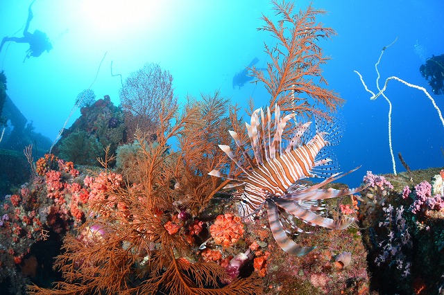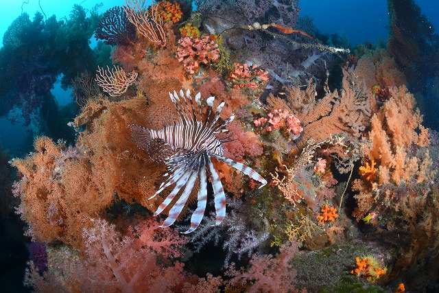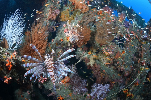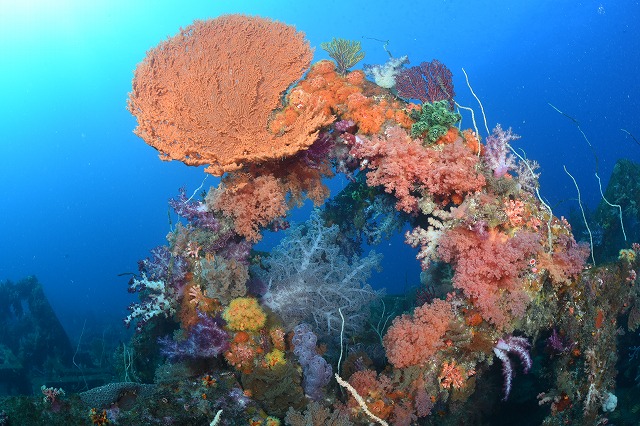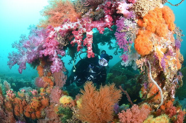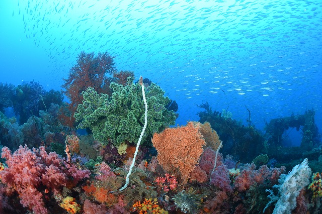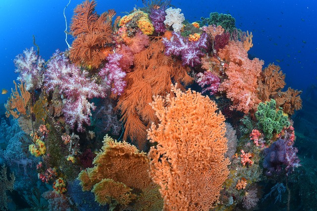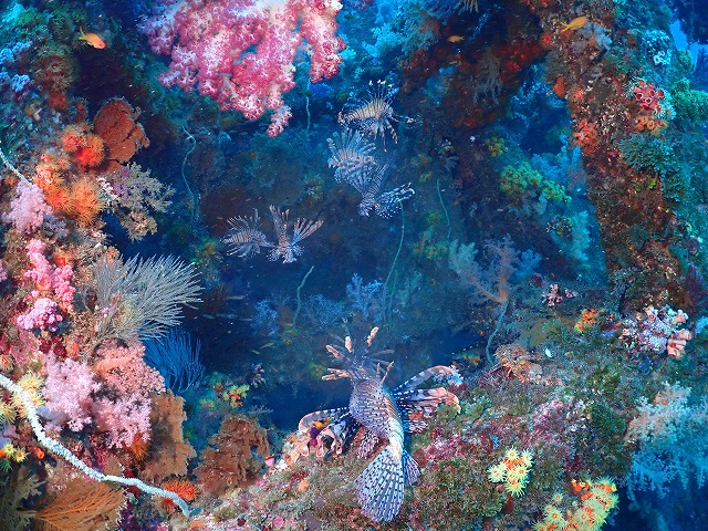 それらを覆うようにソフトコーラルが群生し、色彩豊かなオアシスとなっています。
