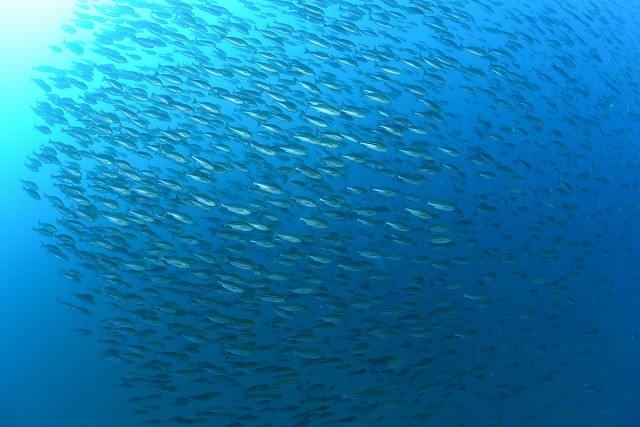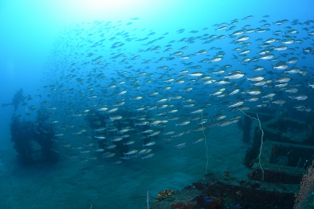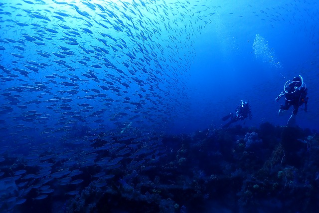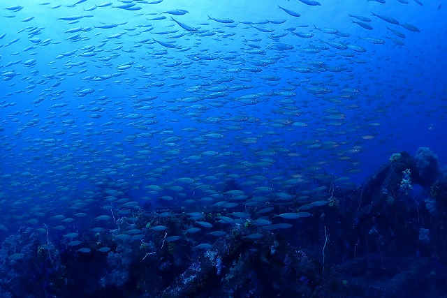 潜降中は水底が見えなくなるほどのアジやイサキの群れに出迎えられ、