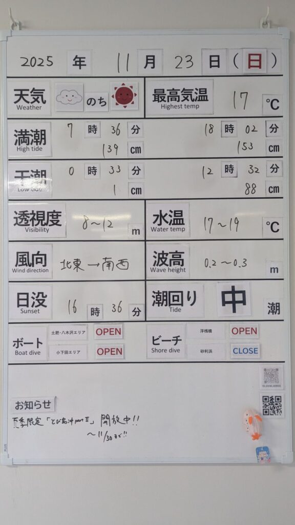 2025年11月23日 / 最終更新日 : 2025年11月23日 toids2021 海況情報 ビーチ&ボートともに【OPEN】です。 風もなく非常に穏やかな海況! ボートも快適に出船できます。 FacebookXCopy