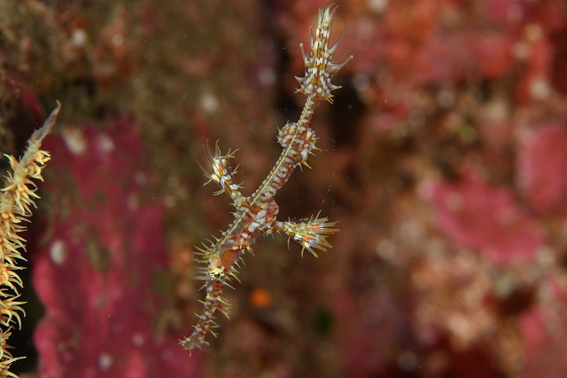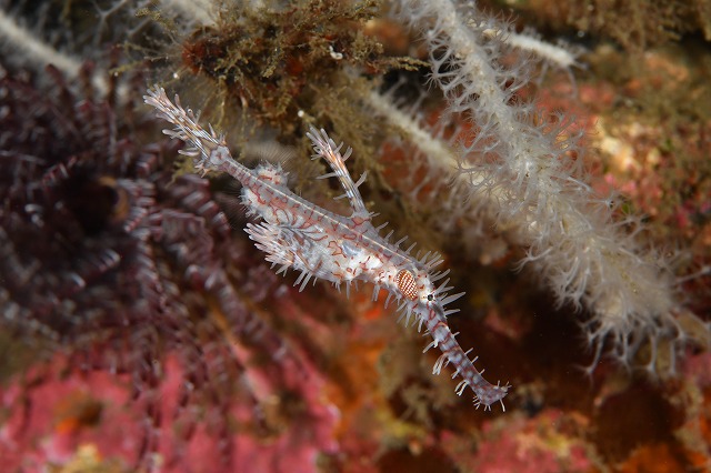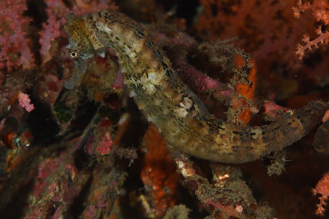 明るい色のソフトコーラルに囲まれて、あきらかに体色が薄くなりました。