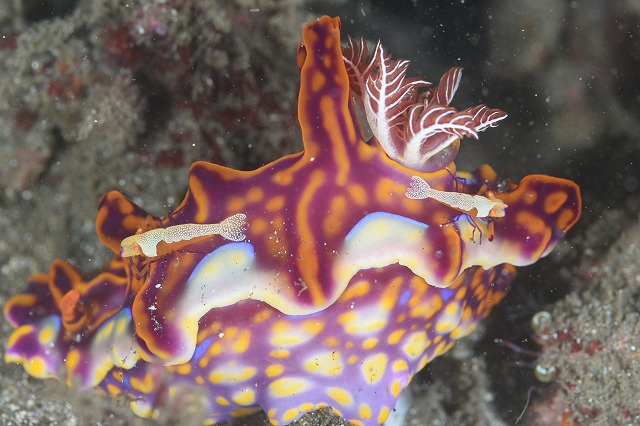 ビーチの沈船の足元に大きなニシキウミウシと擬態したウミウシカクレエビに出会いました。