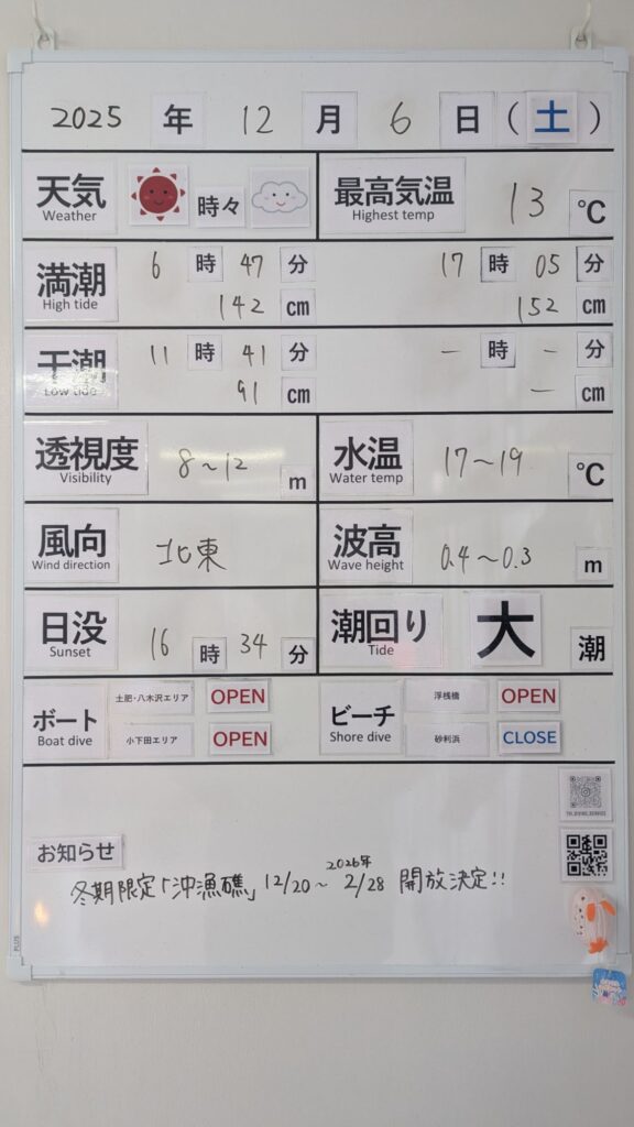 2025年12月6日 / 最終更新日 : 2025年12月6日 toids2021 海況情報 ビーチ&ボートともに【OPEN】です。 東風になり、穏やかな海となりました。 小下田エリアへも出船できますが、まだ若干うねりが残ります。 FacebookXCopy