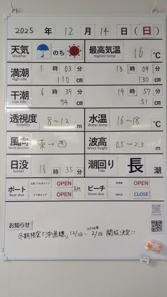 2025年12月14日 / 最終更新日 : 2025年12月14日 toids2021 海況情報 ビーチ&ボートともに【OPEN】です。 朝イチは穏やかですが、昼から西風が強くなり荒れた海になってきます。 ボートは午前中のみのOPENといたします。 ビーチは終日OPENですが、早めほどよいでしょう。 FacebookXCopy