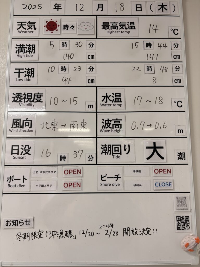 2025年12月18日 / 最終更新日 : 2025年12月18日 toids2021 海況情報 ビーチ&ボートともに【OPEN】です。 非常に穏やかな海況です。 ボートも快適に全域出船できます。 FacebookXCopy