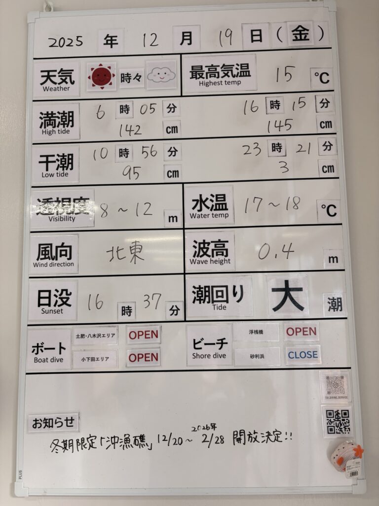 2025年12月19日 / 最終更新日 : 2025年12月19日 toids2021 海況情報 ビーチ&ボートともに【OPEN】です。 非常に穏やかな海況です。 ボートも全域快適に出船できます。 FacebookXCopy