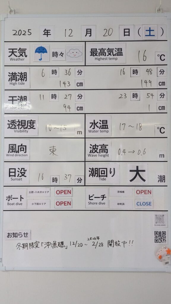 2025年12月20日 / 最終更新日 : 2025年12月20日 toids2021 海況情報 ビーチ&ボートともに【OPEN】です。 風もなく非常に穏やかな海況! ボートも快適に出船できます。 冬季限定ポイント【沖漁礁】、本日より開放です! FacebookXCopy