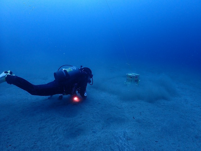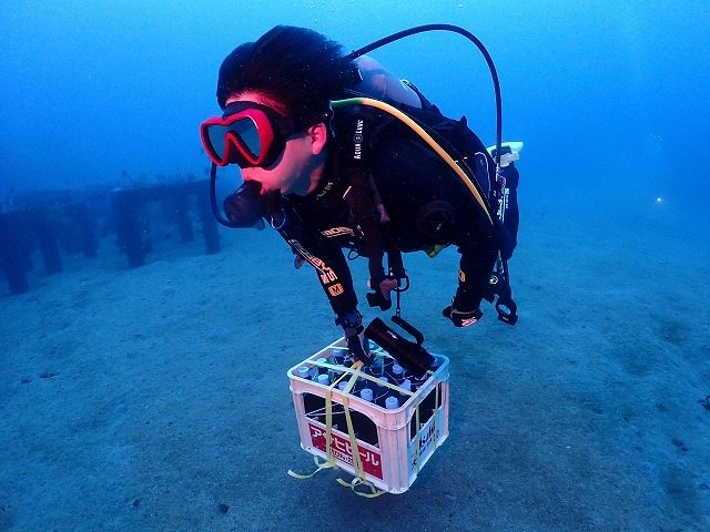 本日は、伊豆市の海底熟成ワイン「らぶ・ま~れ」の水中設置作業に出撃。
