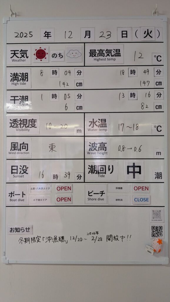 2025年12月23日 / 最終更新日 : 2025年12月23日 toids2021 海況情報 ビーチ&ボートともに【OPEN】です。 東風で海は非常に穏やか! ボートも問題なく出船できます。 FacebookXCopy