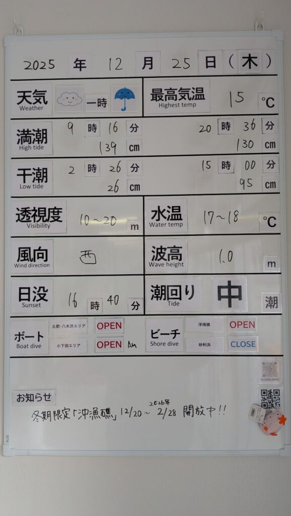 2025年12月25日 / 最終更新日 : 2025年12月25日 toids2021 海況情報 ビーチ&ボートともに【OPEN】です。 朝イチは非常に穏やかな海況です。 午後から西風強くなり荒れてくる予報ですので、ボートは早めが良いでしょう。 ビーチは終日問題なく潜れます。 FacebookXCopy