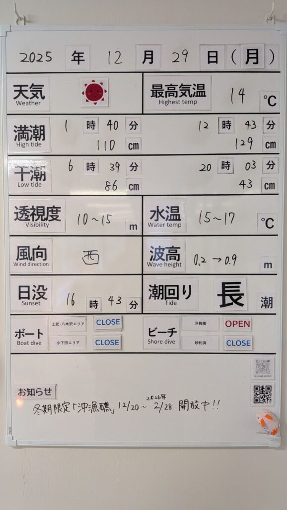 2025年12月29日 / 最終更新日 : 2025年12月29日 toids2021 海況情報 ビーチのみ【OPEN】、ボートは【CLOSE】です。 非常に穏やかな海況です! 午後からは西風が強くなり揺れが入ってきそうですので、早めほど良いでしょう。 FacebookXCopy