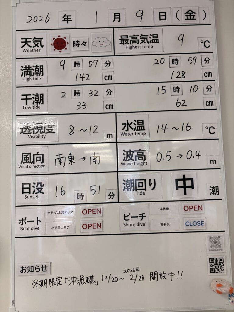 2026年1月9日 / 最終更新日 : 2026年1月9日 toids2021 海況情報 ビーチ&ボートともに【OPEN】です。 穏やかな海況です。 ボートは小下田エリアまで出船可能です。 FacebookXCopy