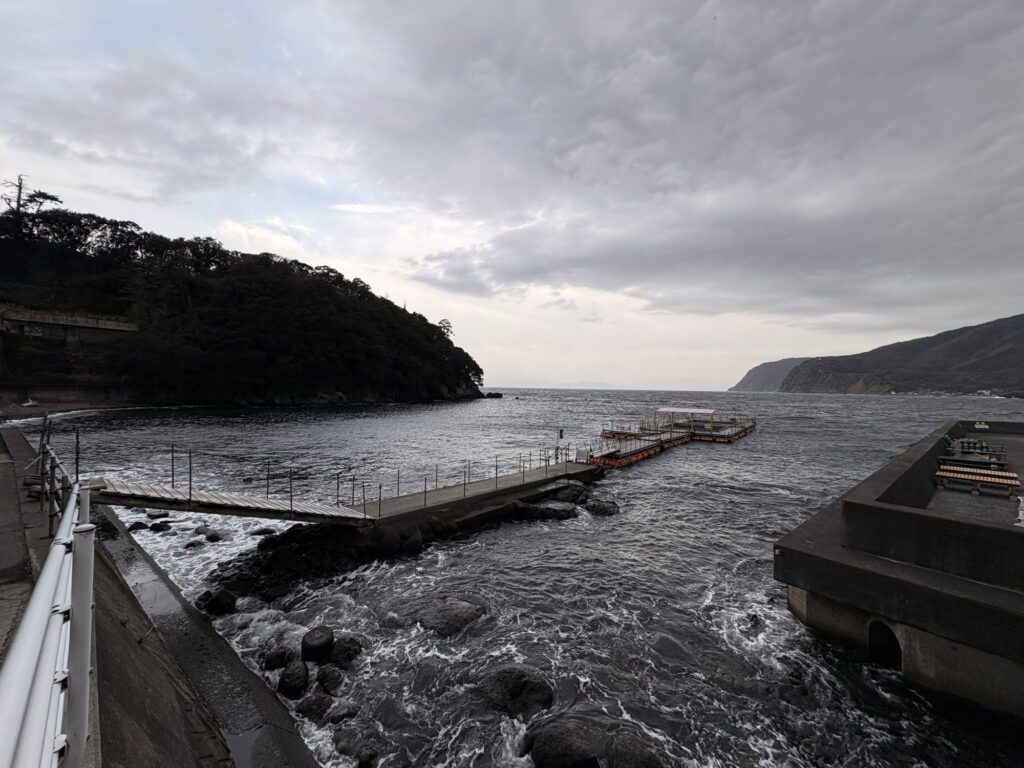 鉄壁のビーチは問題なく潜れますが、うねりが入っていますので揺れる桟橋にご注意ください。