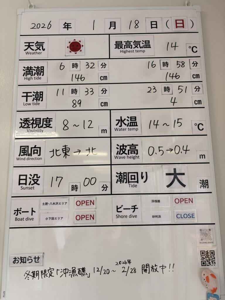 2026年1月18日 / 最終更新日 : 2026年1月18日 toids2021 海況情報 ビーチ&ボートともに【OPEN】です。 非常に穏やかな海況です! ボートは小下田エリアまで快適に出船できます。 FacebookXCopy