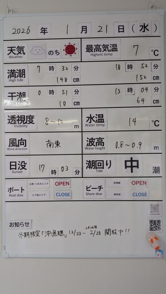 2026年1月21日 / 最終更新日 : 2026年1月21日 toids2021 海況情報 ビーチ&ボートともに【OPEN】です。 小下田エリアはうねりが残るためボートは八木沢エリアのみのOPENです。 鉄壁の通り崎ビーチも若干揺れがありますが、次第に穏やかになっていくでしょう。 FacebookXCopy
