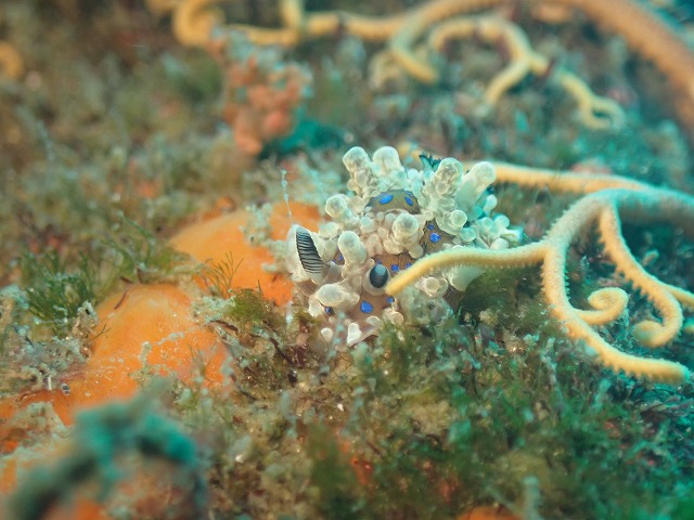 毒々しい色の斑点がオレンジ色のカイメンの上でやたら目立ちます。