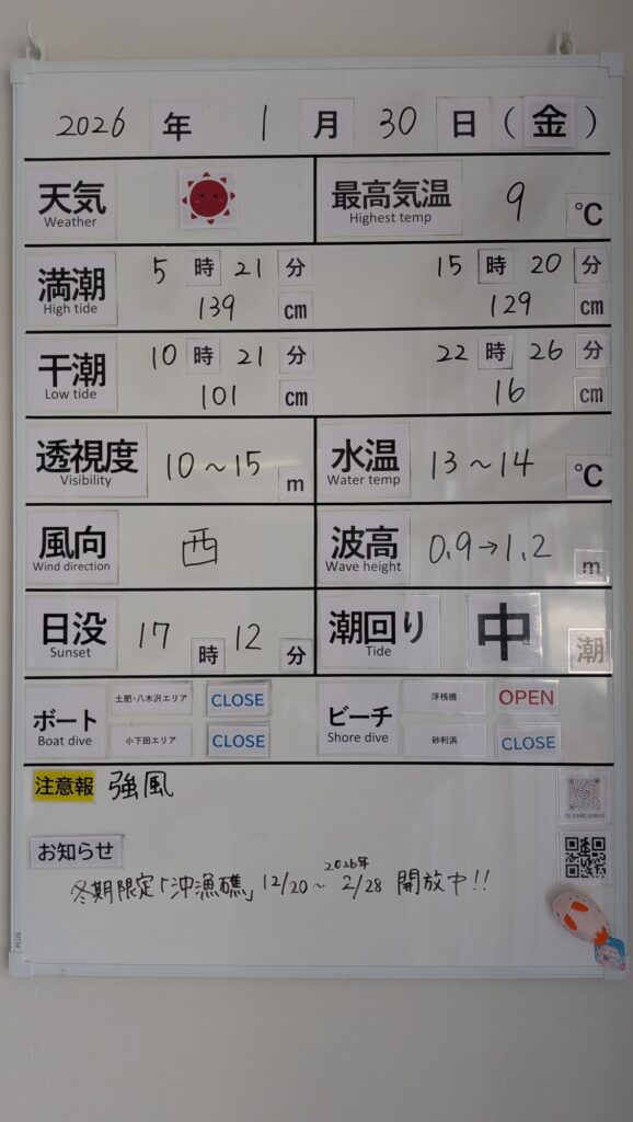 2026年1月30日 / 最終更新日 : 2026年1月30日 toids2021 海況情報 ビーチのみ【OPEN】、ボートは【CLOSE】です。 西風の影響でうねりが大きいためボートはオールCLOSEです。 ビーチは終日問題なくOPENです!! FacebookXCopy