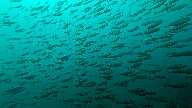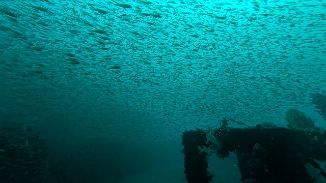 さっきまで霧のように覆っていた場所からいっせいにいなくなり、反対に1匹もいなかった場所に濃い魚影が現れます。
