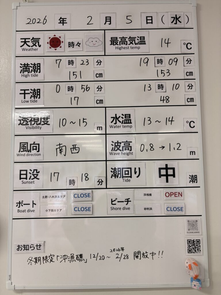 2026年2月5日 / 最終更新日 : 2026年2月5日 toids2021 海況情報 ビーチのみ【OPEN】、ボートは【CLOSE】です。 朝イチは穏やかですが、次第に南西の風が強く吹く為ボートはオールCLOSEといたします。 鉄壁のビーチは問題なく潜れます! FacebookXCopy